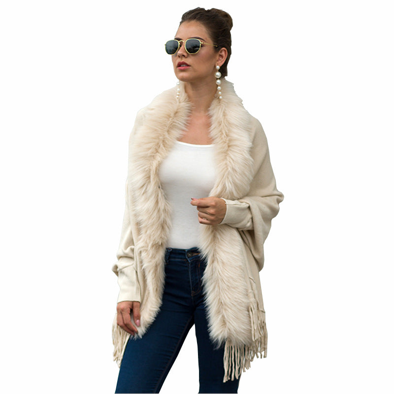 Autumn Winter Tassel Cape Shawl Fur Collar Cloak Solid Color Cardigan Sweater