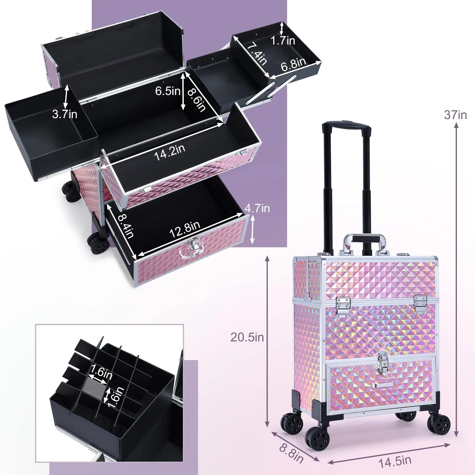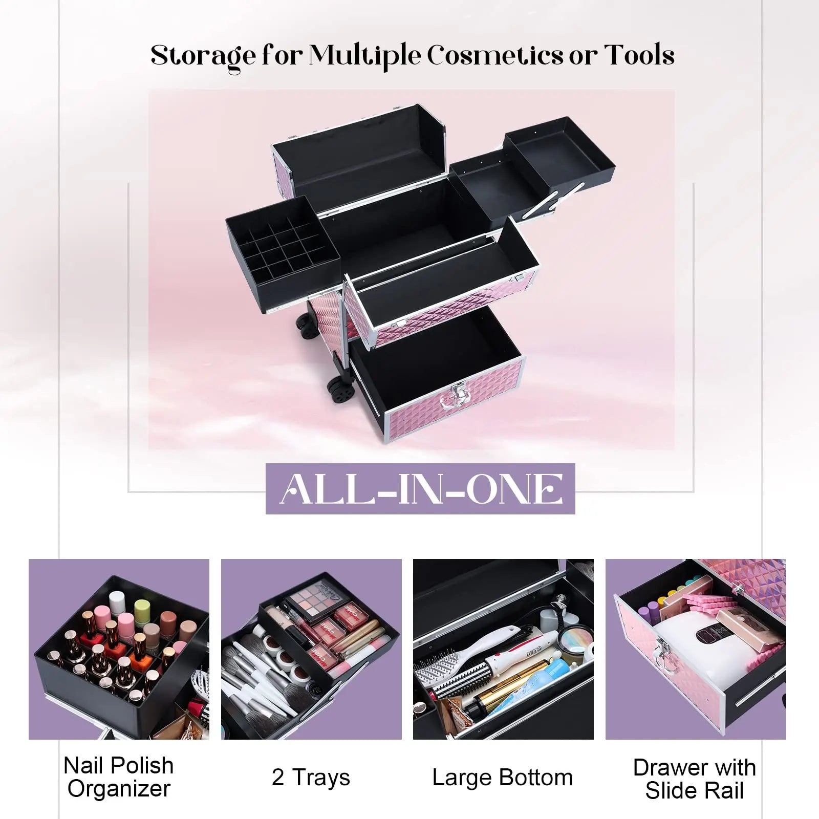 Brand New for Pink Rolling Makeup Trolley Large Capacity Portable Travel Cosmetic Case Open Closure for Beauty Case Organizer